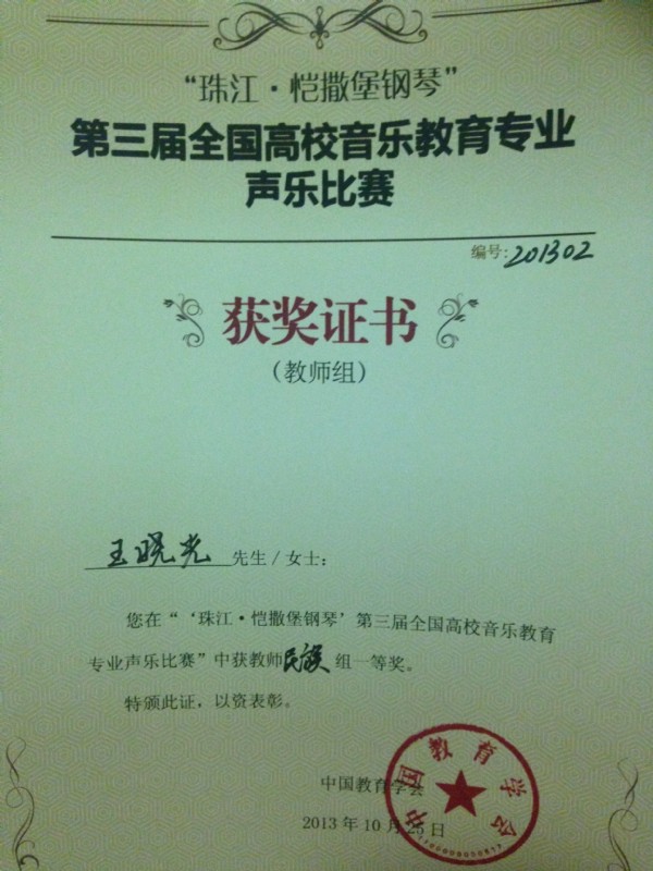 全国高校音乐教育专业声乐比赛由中国教育学会主办,旨在加强高校音乐教育专业的教学研究,提高教学质量,促进我国高校音乐教育专业声乐教育教学的改革与发展。比赛分美声组和民族组,本届大赛全国共有186所高校的800名师生参赛,37名教师进入决赛。我校参赛的民族声乐教研组王晓光老师,获得教师民族组一等获。
