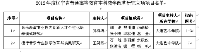 为全面贯彻落实国家和省中长期教育改革和发展规划纲要及教育部全面提高高等教育质量工作会议精神,深化教育教学改革,全面提升本科人才培养质量,根据《辽宁省教育厅办公室关于做好2012年度辽宁省普通高等教育本科教学改革研究项目立项工作的通知》(辽教办发[2012]89号)精神,我院组织开展了2012年度辽宁省普通高等教育本科教学改革研究项目立项申报工作。省教育厅按照立项工作管理办法和程序,经专家委员会评审,确定了我院申报的2项教改项目为2012年度辽宁省普通高等教育本科教学改革研究立项项目。